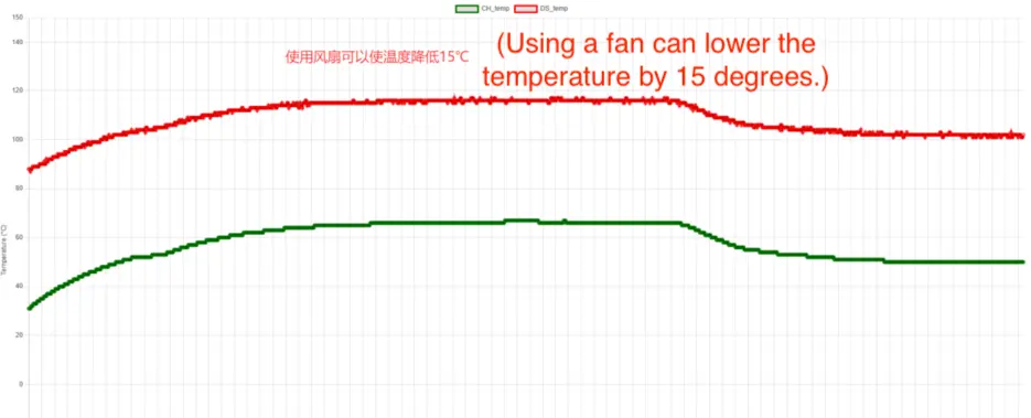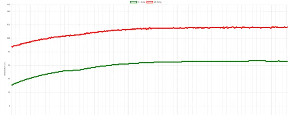 Tras aproximadamente una hora de funcionamiento sostenido: - la superficie externa alcanzaba unos 65 °C - la temperatura interna alcanzaba picos alrededor de 115 °C
