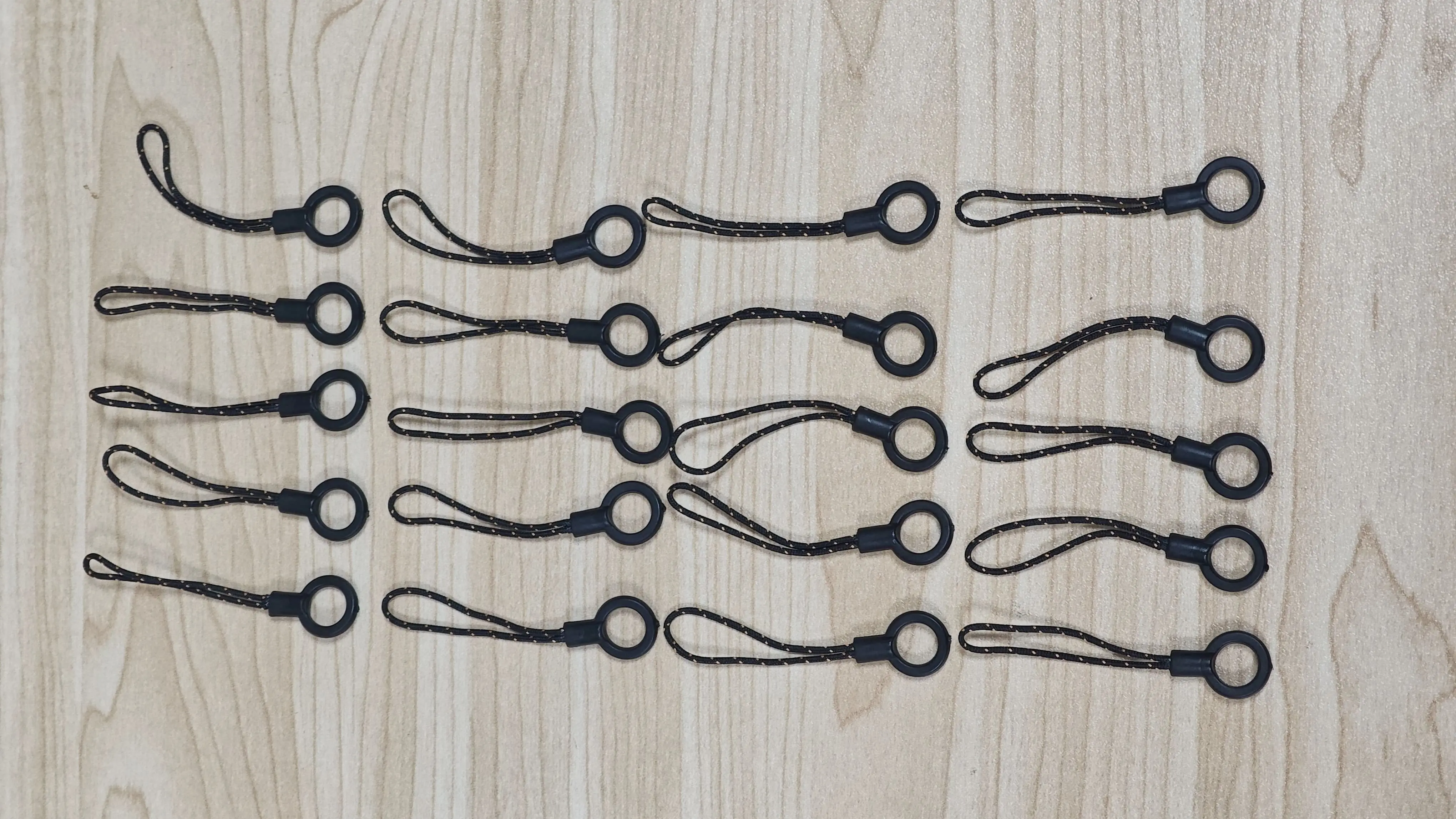 Connector cap tethers staged in counted batches, ready for packaging and repeatable assembly flow.