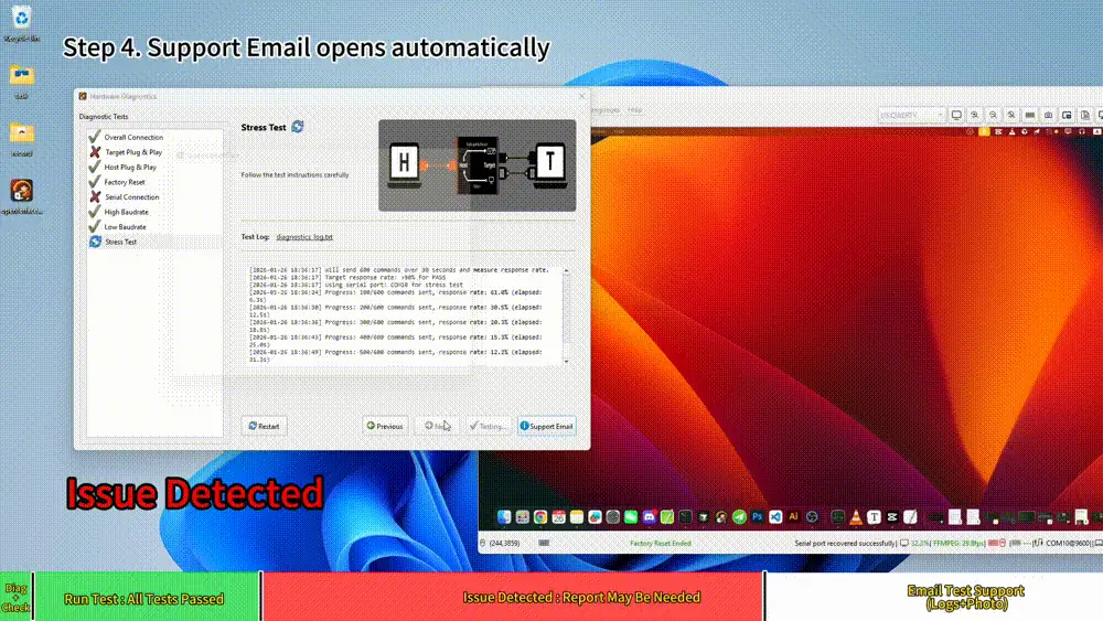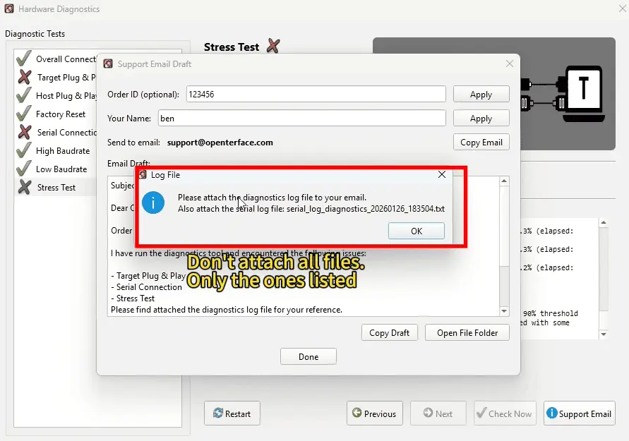 When the diagnostics finishes with an issue, a Support Email window will open automatically.