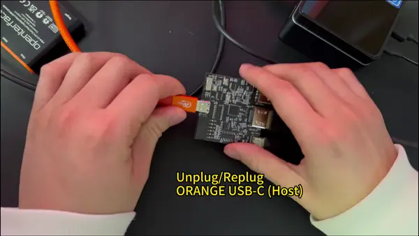 Step 7: Click Start Test, then unplug and replug the orange USB-C (host side) when asked.