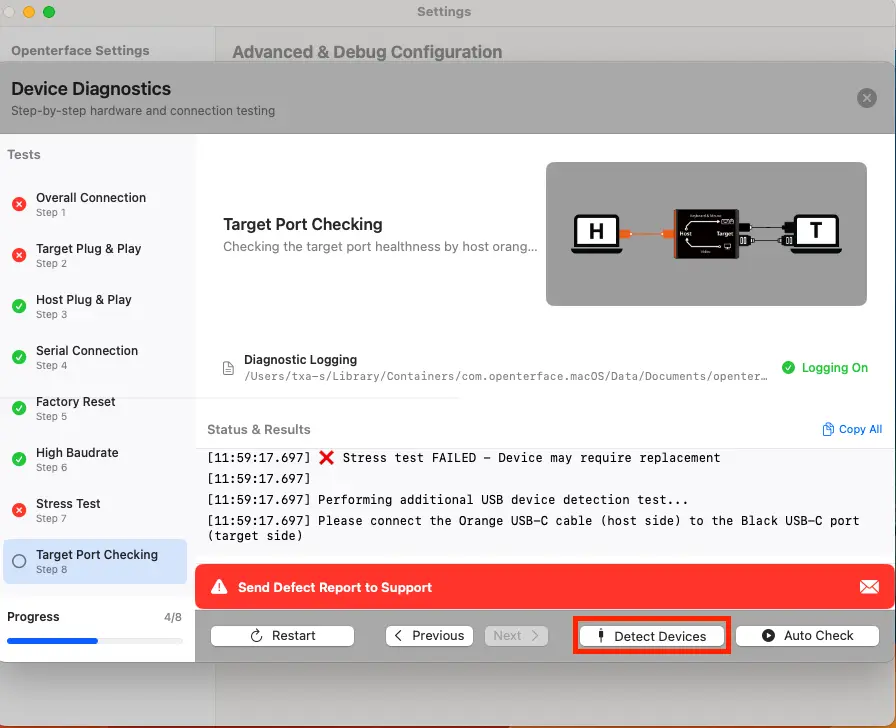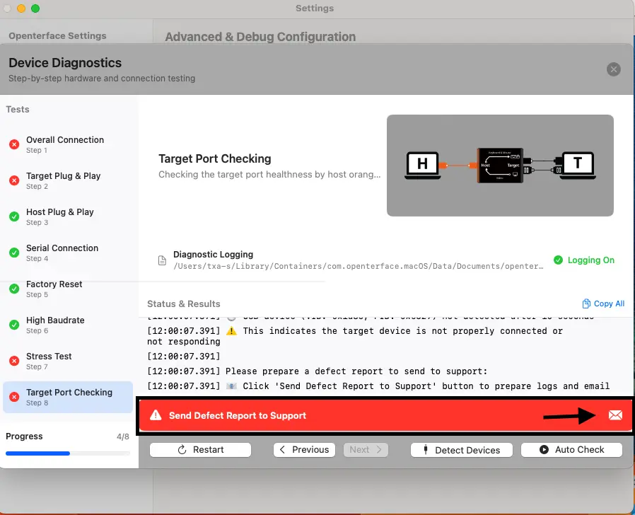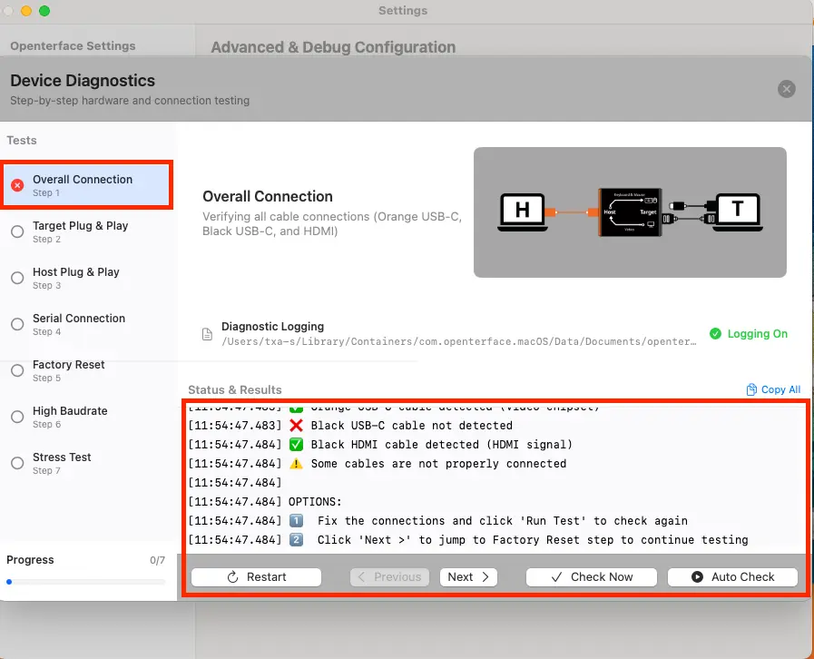In this example, Overall Connection shows FAIL first because a target-side keyboard/mouse (HID) issue affects the overall check. This is an early indicator, not a separate issue. (You'll see the FAIL status highlighted next to "Overall Connection" on the left.)