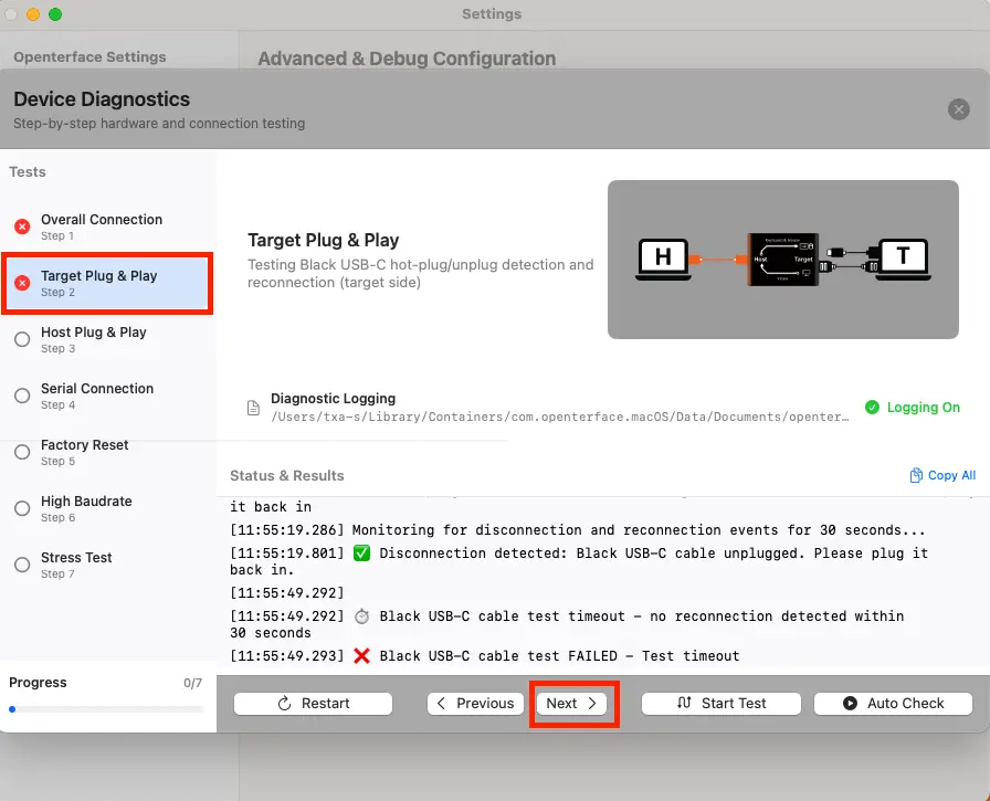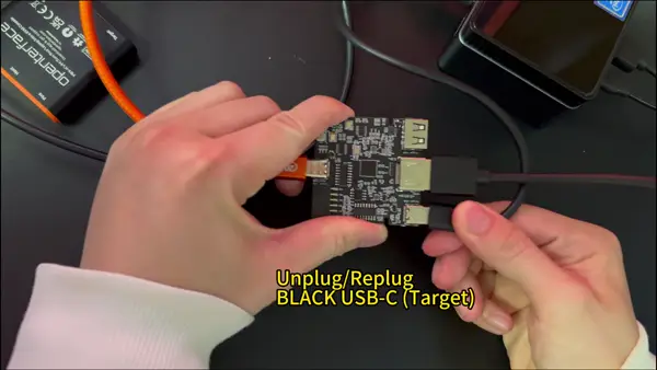 Step 6: Click Start Test, then unplug and replug the black USB-C (target side) when asked.